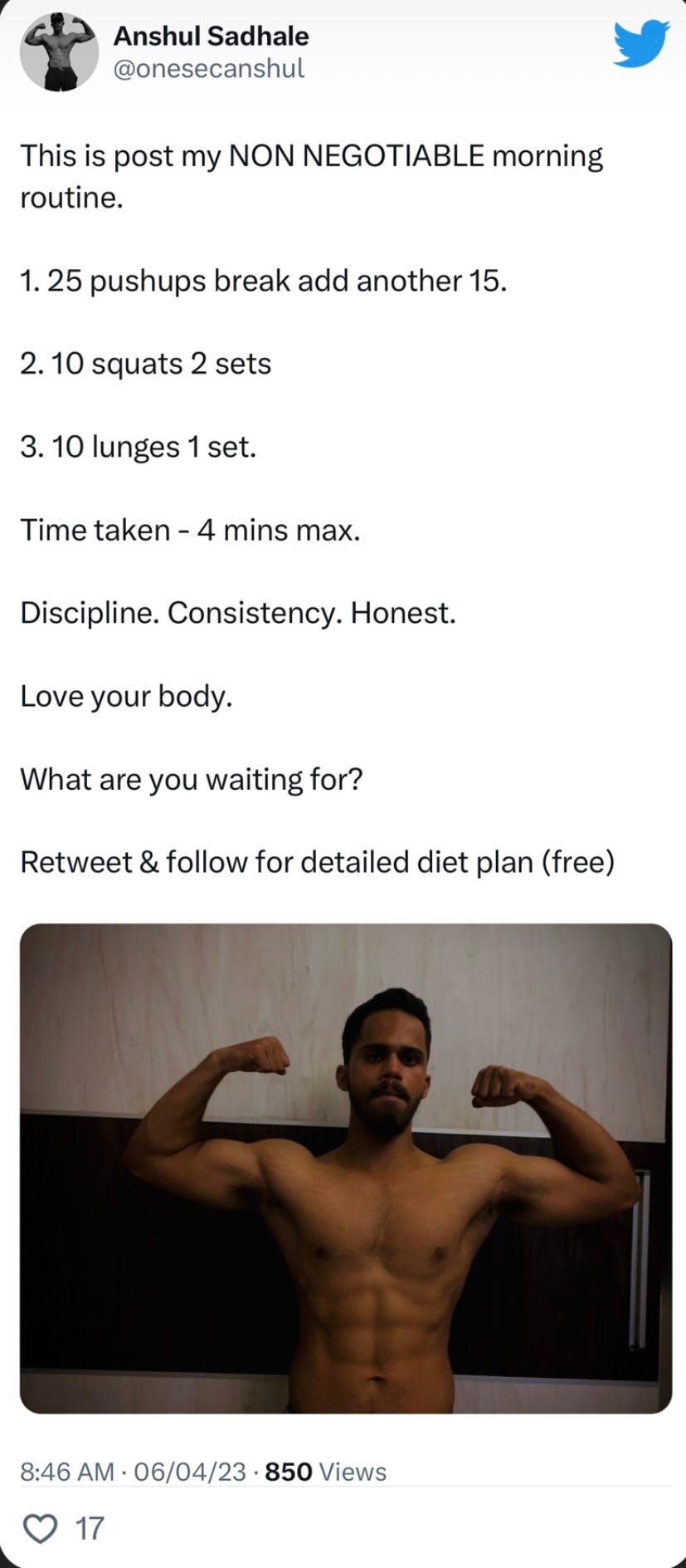 He’s never been to the gym. Been a 5am bird -walking his way into his 50s.